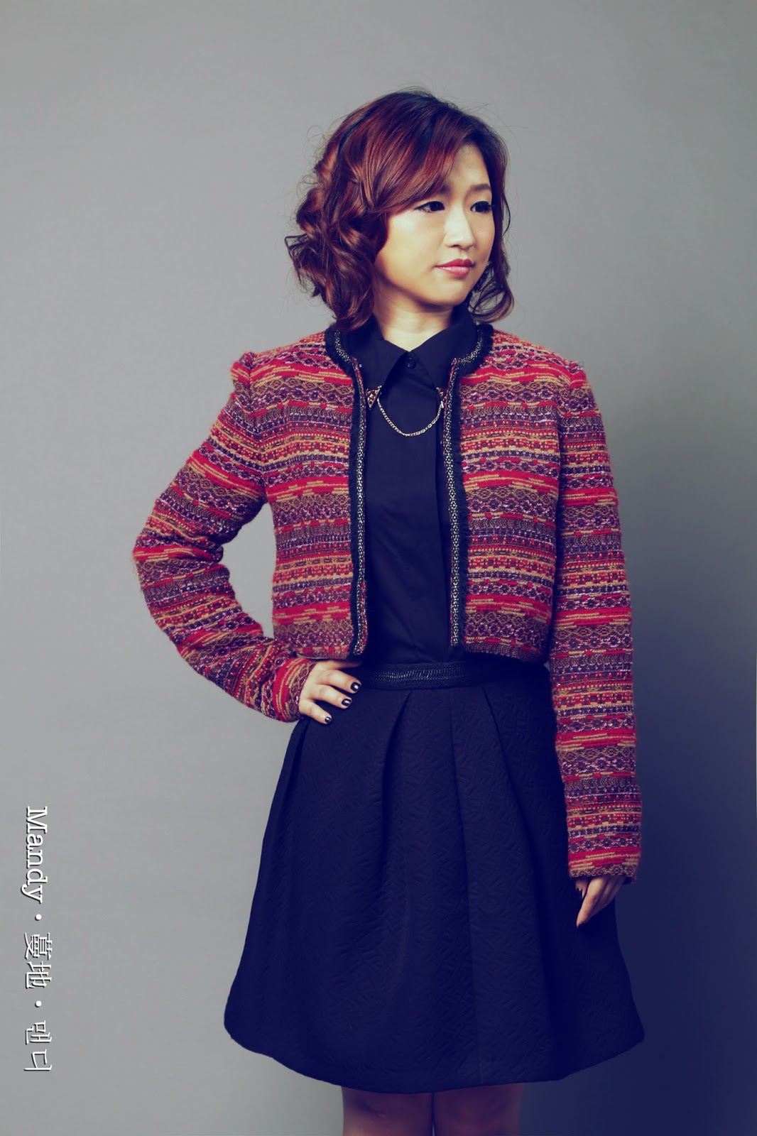 民族色彩外套 + 黑色裇衫 + 黑色半截拋拋短裙