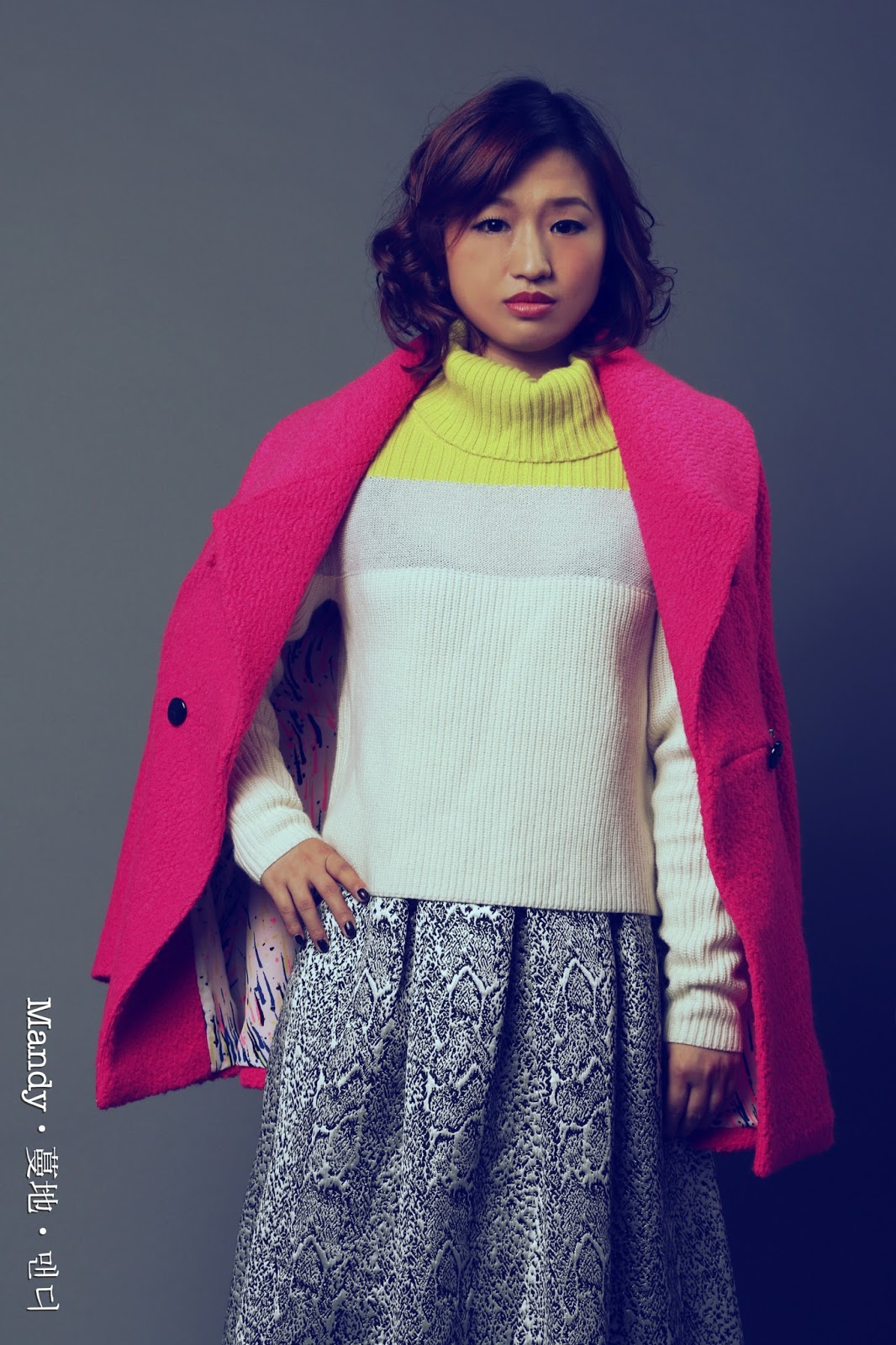 我會配上比黃色更來鮮明的珊瑚色毛海外套!