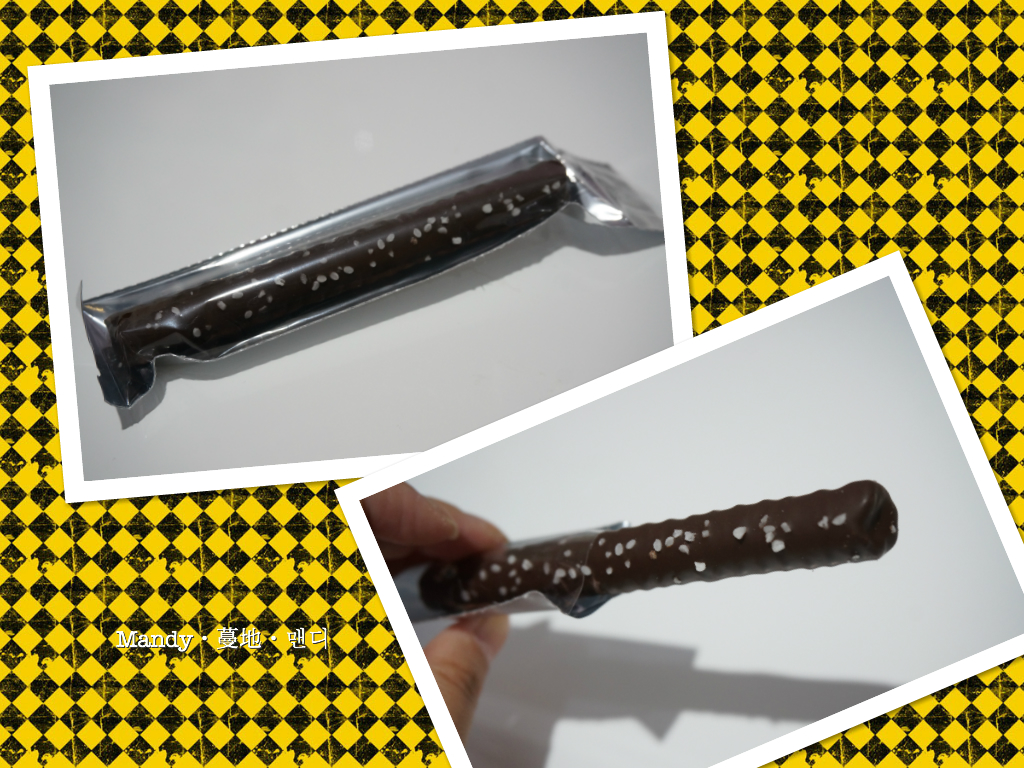 是外層沾上一層64%黑朱古力及灑上不同口味的配料的脆條