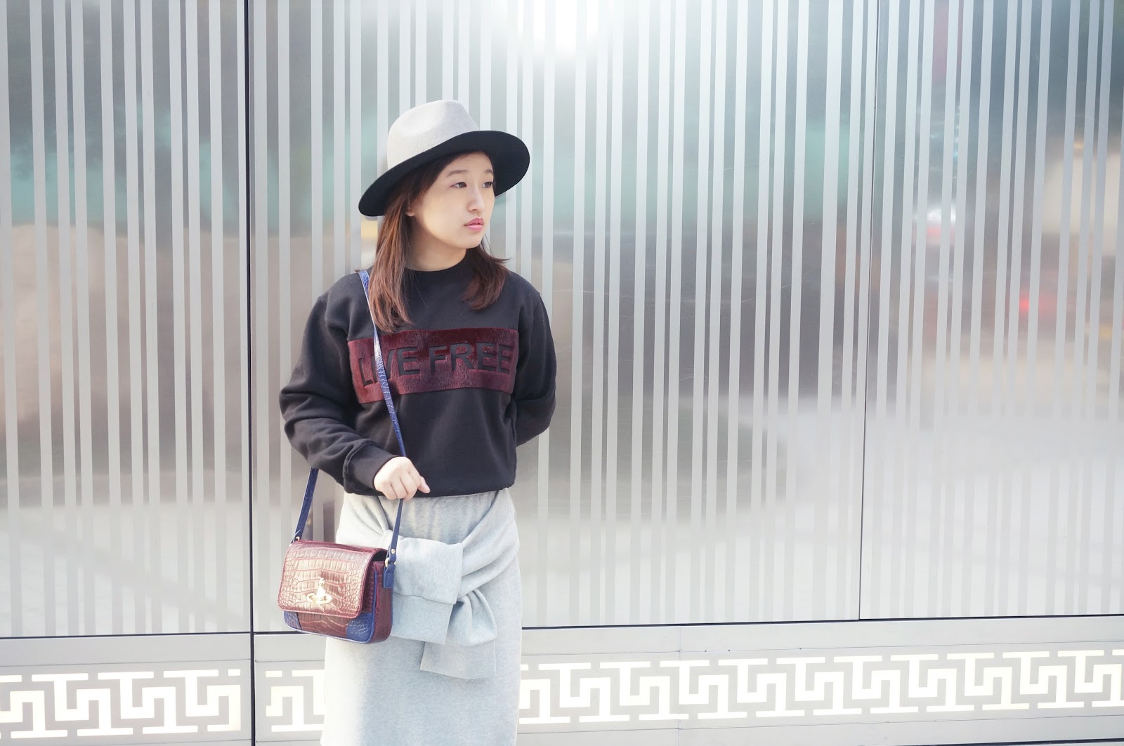 色調配搭今次以簡單為主,黑色的衛衣襯上灰色的裙子。