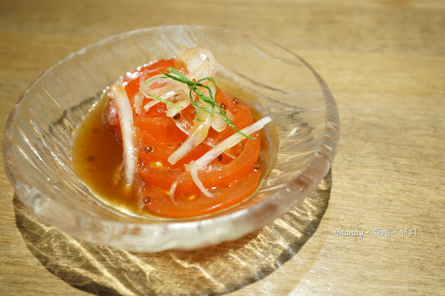 用上日本醬油的蕃茄前菜,味道酸酸咪咪加上洋蔥的辛辣,